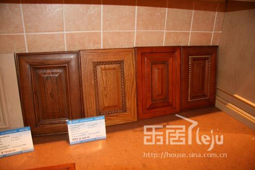 使用实木制作橱柜门板,风格多为古典型,通常价位较高。其门框为实木,以樱桃木色、胡桃木色、橡木色为主。门芯为中密度板贴实 木皮,制作中一般在实木表面做凹凸造型,外喷漆,从而保持了原木色且造型优美。这样可以保证实木的特殊视觉效果,边框与芯板组合又可以保证门板强度。